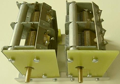 | the rotors of my tuning gangs are positively grounded to frame by rotary straps. the insulator block adapts the 3/8 inch rotor shaft to 1/4 inch for front panel knob. | gang mounted on perspex plate | original brass wiper was just riveted to frame |