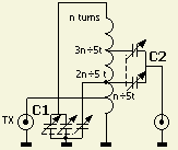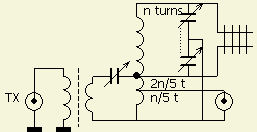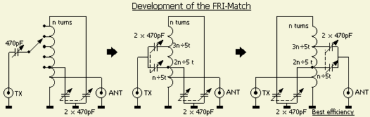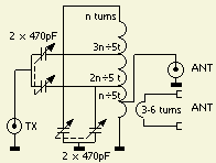 In spite of the fact that I can't figure out how the FRI-match is supposed to work, I built one and am quite pleased with it. It is compact and does not have a variable inductor. You can use an air core or another fixed inductor. Jayram recommends using 5 to 8 micro henries total tuned with ganged 470 pF capacitors. For the inductor I used 26 turns on a T-200-6 (CWS, Amidon) large powdered iron core wound for a total of 7 micro henries. Once you know how many turns you need for the entire inductor, calculate each of the 3 taps on the coil by multiplying the total turns by the number shown below and divide by 5. I couldn't find 470 pF capacitors, so I used 365 pF caps which are available from RF Parts Company (RFparts.com).