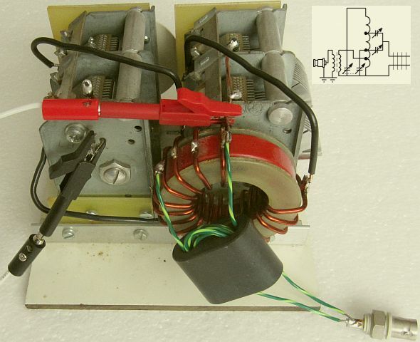 Links een goed werkende uitvoering met aan de ingang een ! : 1 trafo met een varkensneus. Met mijn huidge inverted V van 2 × 16.50 m was het niet nodig om in en uitgang te verwiselen.
