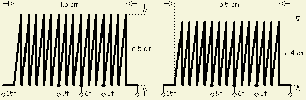 Voorbeeld: een spoel met een kleine diameter en bij voorbeeld 30 windingen, komt de eerste tap op 30 ÷ 5 = 6 wdgn, de tweede tap: (2 × 30) ÷ 5 = 12 wdgn en de derde tap: (3 × 30) ÷ 5 = 18 wdgn.