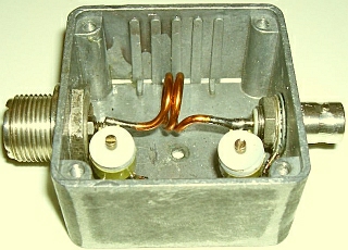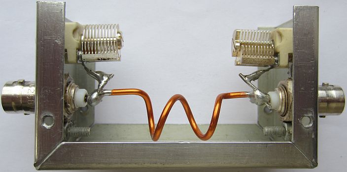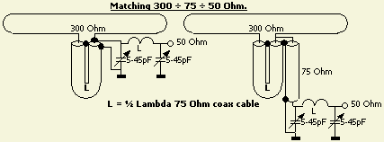 De schakeling kan ook dienen om een 50 Ohm coaxkabel aan te passen op 75 Ohm of omgekeerd. Het laatste type kabel heeft minder verliezen en dat wordt vaak vergeten. Als voorbeeld hoe dat te maken is, worden er twee spoeltjes getoond. Het kleine model is van 1 mm draad, heeft 4 windingen en is op een 5 mm boortje gewikkeld. Het grotere model is van 2 mm draad, heeft 2 windingen en is op een 10 mm boor gewikkeld. Voor een groter vermogen kunt u beter twee («fig) variabele luchtcondensatoren monteren. Bij de spoel in de rechter foto moest bij een overgang naar 75 Ohm de spatie iets vergroot worden.