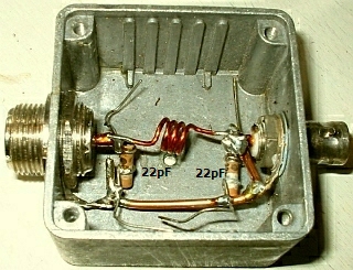 Om dergelijke hulpmiddelen te vermijden en aanpassingen te verbeteren monteer ik een pi-filter (fig») tussen de twee te koppelen elementen. Het voordeel is een afgestemde kring die de nadelige elektrische eigenschappen van genoemde pluggen compenseert. Bovendien kan men door afregelen de SWR in het systeem verbeteren. Hiernaast ziet u een goed werkend testmodel. Met beide vaste condensatoren van 22 pF hoeft men meestal niet meer te doen dan het spoeltje uit te rekken of in te drukken om een SWR = 1 te bereiken.