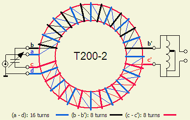 The sequence of the windings. Left side: blue = input, black & red = capacitor. Right side: black & red = inductor.