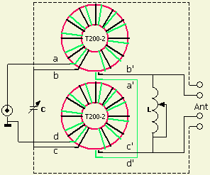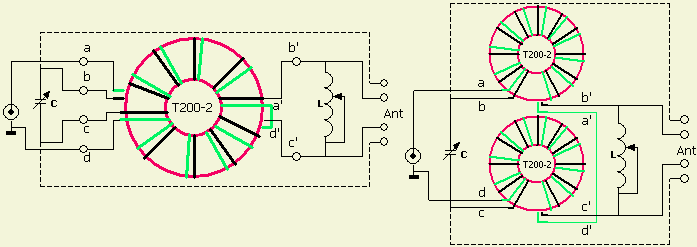 With some antenna systems a better efficiency can be obtained when the antenna is connected as shown by the dotted line. It is also possible to use two separate toroids and I have not noticed any difference between an ATU with two cores or with a single core.