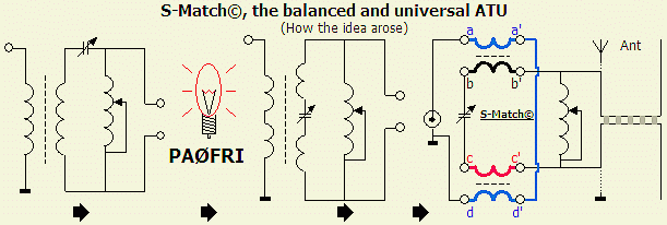 After an extensive research and experimenting I achieved the design shown in the above drawings of the Balanced Universal ATU System. To make it distinctive from other types of ATU's, I call my design S-Match©. The system is intended to accommodate balanced antenna systems transmitting on a very wide frequency spectrum, ranging from 160 m band up to 10 m band. Likewise, it is able to take proper care of impedances and associated reactances ranging from less than 20 ? and up to 3000 ?. Built with the proper components, it is able to transfer loads of more than 1000 Watts. This balanced antenna-tuning unit has only three components: a capacitor, a roller inductor and a balun or RF transformer. The input circuits are isolated from the output circuits, resulting in a system, which is suitable also for single-wire antennas and coax fed antennas.