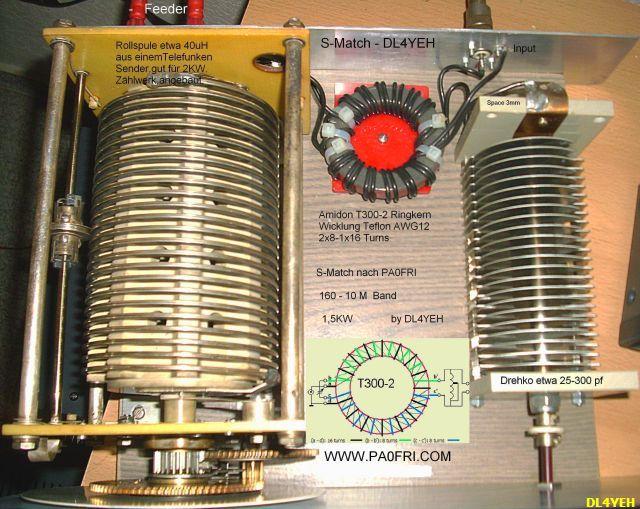 Ich habe mir auch denn S-Match mit einem Split-Drehko 2 × 220/1.5 kV, einer RollSpule 15.5µH (1.5 Silberdraht), sowie 2 × T200-2 Rinkerne nachgebaut. Der S-Match macht seine Arbeit von 10 m bis 160 m hervorragend an einem Symetrischen Dipol! Werde dem S-Mach aber noch ein Kreuzzeiger-Stehwellen-Messgerät hinzufügen in das Gehäuse. Ich bin super begeistert und kann ihn nur weiter Empfehlen.
