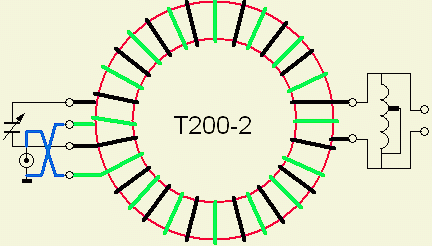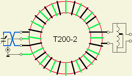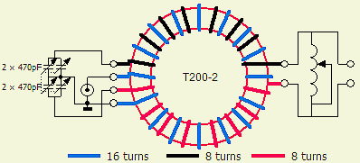 The transformer contributes a lot to the final result, which is my conclusion after I tested many types of windings. A couple of ham friends successfully tested a number of my own ideas for a suitable HF transformer/balun. The above chosen type of transformation ensures that input and output connections are galvanic isolated. The experiments show that an inductance of about 3 µH is a good compromise for all HF bands. Sometimes the minimum inductance (coil + balun) is too large for some 10-30 m antenna systems. Subsequently, extending or shortening the feeding line was necessary to change the antenna system impedance to cope with the tuner, or build a separate ATU with fewer turns e.g. less than 3 µH on the toroid.