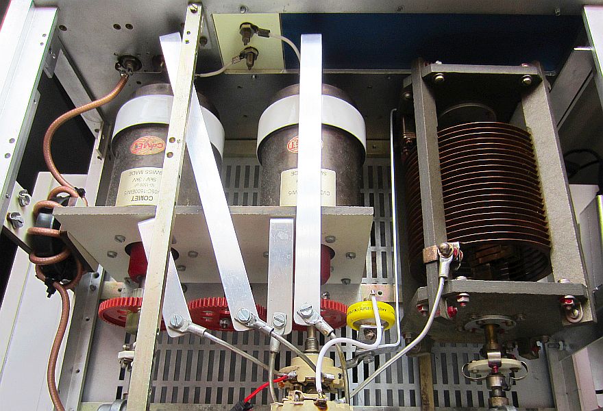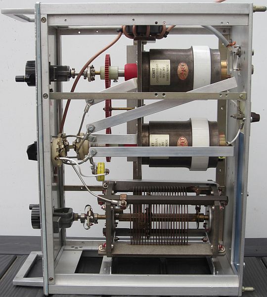 De twee 400 pF/1500 V variabele condensatoren zijn gekoppeld met kunststof tandwielen die gesloopt werden uit stappen schakelaars van oude telefooncentrales.