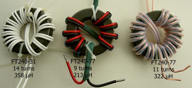 Een FT240-31 is geschikt voor 400 W. Onder gunstige omstandigheden heb ik het met 800 W getest, maar beter is om het op 400 W te houden. Met 13 windingen wordt de zelfinductie 308 µH en met 11 windingen 220 µH.