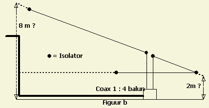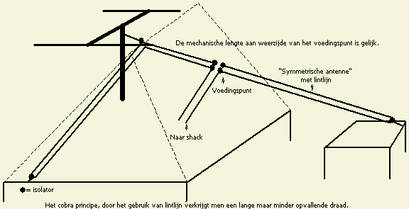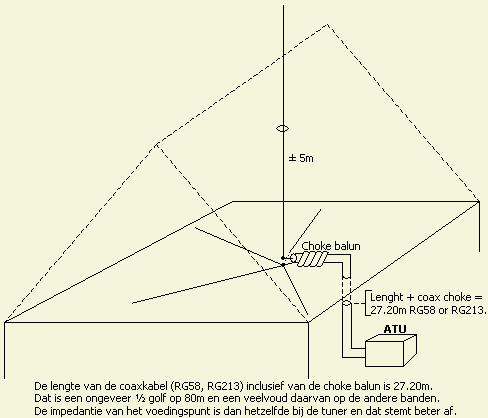 Wanneer een voeding met coaxkabel niet te vermijden is, maak dan de openlijn zo lang mogelijk en ga dan via een balun of externe automatische tuner over op coaxkabel om de woning binnen te komen.