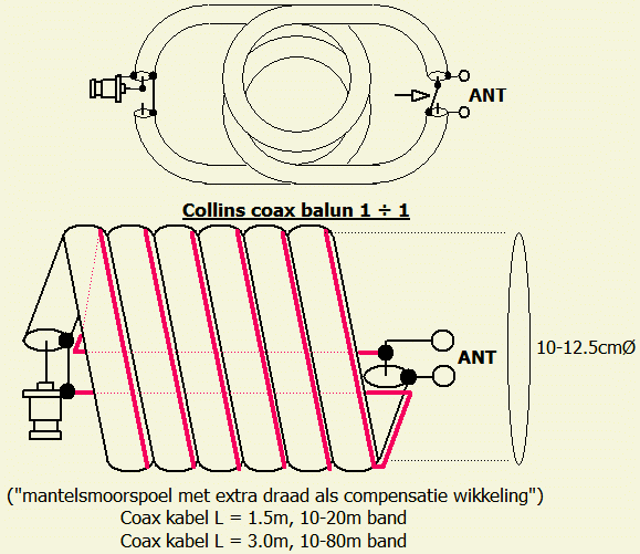 In oudere handboeken vindt men 1 ÷ 1 baluns gemaakt van 50 Ohm coaxkabel waarbij twee tegengestelde windingen als luchtspoel aan elkaar getaped zijn of het gewikkeld is op één kunststof pijp (fig»). In feite is één meervoudige winding met coaxkabel al een mantelsmoorspoel of "choke balun", maar er is nog een extra tegengestelde compensatie winding met een draad of met de buitenmantel van een tweede coaxkabel.