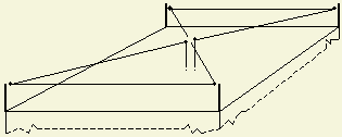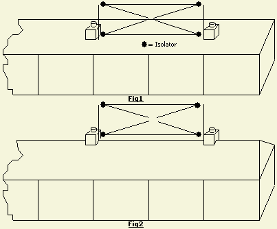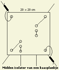 Heeft u buiten te weinig plaats dan kunt u het op zolder proberen. Span zoveel mogelijk draad («fig) tussen een aantal isolatoren, bij voorbeeld volgens de tekening. Voedt de antenne met een open lijn gekoppeld aan een goede symmetrische tuner. |