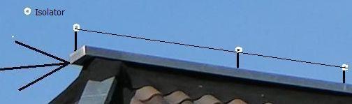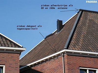 PAØRBA heeft ook weinig ruimte en een antenne op zolder voldeed niet omdat bijna niemand zijn signaal, zelfs met 100 W, kon nemen. Daarom is hij van plan om een zinken dakgoot als tegencapaciteit en een zinken strip op de nok als antenne te gebruiken. Dat kan goed werken, maar vonkoverslag van de strip naar de nokpannen is bij nat weer niet onwaarschijnlijk. Door allerlei verontreinigingen in het milieu is regenwater of ander vocht geleidend geworden. Tijdens een proef met een van mijn lineairs sprongen er vonken over van de natte lintlijn naar de vochtige muur op ongeveer 2 cm afstand. Als op geringe hoogte (± 10 cm) boven de strip een draad gespannen wordt, is de kans van weglekken vrijwel nihil. Als afstandstukken kan men isolatoren inzetten die bij afrasteringen van weilanden gebruikt worden.