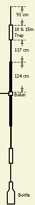 Tussen de feeder en AT-897 tuner van LDG maakte hij een plastic waterflesje voorzien met 10 windingen RG213 om een 1 : 1 mantelsmoorspoel te maken. De tuner kan zelfs op