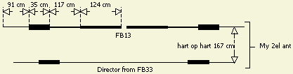 Verder geeft een director iets meer versterking dan een reflector. Reden waarom mijn meer dan 35 jaar gebruikte Yagi was samengesteld uit een FB13 als radiator en een director van een FB23. De gekozen afstand tussen beide elementen was optimaal voor de