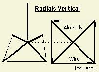 Als het praktisch onmogelijk is om radialen in hun volle lengte aan te brengen, kan men het "afspannen" volgens de tekening doen. Het beste is om het begin van een radiaal als metalen (Alu)staaf uit te voeren en het laatste deel als draad bevestigd via een isolator aan de opvolgende radiaal. Men kan ook in plaats van metaal het begin doen met een kunststof staaf (zonder koolstof) waar een draad langs loopt dat bevestigd is met bij voorbeeld kabelbinders.