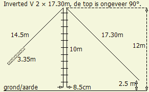 De lengte van de antenne tussen de twee afspanpunten is precies