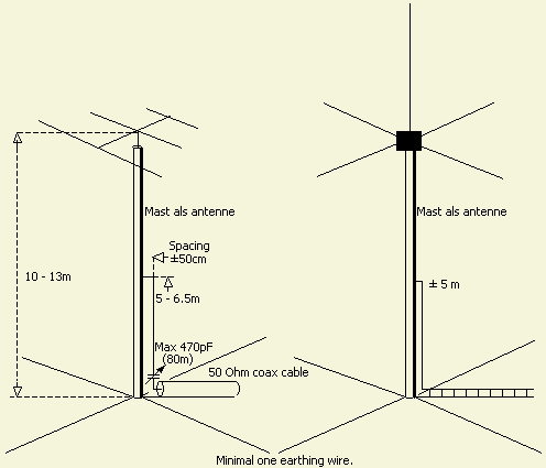 De langere uitvoeringen («fig») voor meer dan 5 banden (incl. 40m) zoals Cushcraft R7 en HyGain DX-77a moeten in ons tegenwoordig stormachtige klimaat voorzien worden van tuidraden.