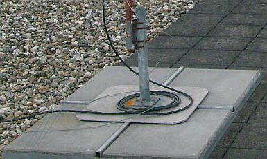 Voor het verankeren van een parasol in een tuin wordt de afgebeelde kant en klare metalen constructie aangeboden en dat lijkt mij met verzwaard met veel tegels ook geschikt voor onze doeleinden. Een antenne fabrikant in Brielle heeft ook zoiets in zijn assortiment.