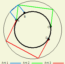Een verticale antenne met twee radialen die 180° uit elkaar liggen is een effectieve antenne. Het systeem is gebaseerd op patenten uit 1933 en 1934. Een vereenvoudigde formule voor het voedingspunt is: R = 18(1 + sin ß)² ß is de hoek van de radialen ten opzichte van het horizontale vlak. Als ß = 0° wordt R = 18(1 + 0)² = 18 Ohm en als ß = 42° wordt R = 18(1 + 0.67)² = 50 Ohm met ß = 90° wordt de antenne een dipool met R = 72° |