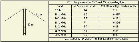 Regelmatig hoort men discussies over het al dan niet inzetten van coaxkabel of lintlijn voor het voeden van een antenne. Bij een resonante (trap)antenne voor één of meer banden is een coaxkabel geen probleem, maar wanneer een willekeurige dipool gebruikt wordt (ook voor meer dan één band) zijn de verliezen in een coaxkabel door misaanpassing aanmerkelijk. G3LDO heeft in een artikel van Radcom (RSGB) dat verschil overduidelijk in een aantal tabellen weergegeven. Ter illustratie ziet u in deze tabel (fig») een in ons land veel voorkomende antenne situatie van een (te) korte dipool met een lange voedingslijn. Het zal duidelijk zijn dat zelfs in een open lijn van 100 m geen merkbare verliezen zullen opreden. Gebruik dus als het kan een openlijn voor uw antennesysteem en een doorvoer in een muur hoeft ook geen probleem te zijn als u bij voorbeeld mijn methode daarvoor bekijkt.