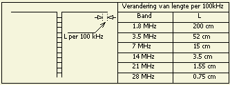 Als u een ½ λ dipool met dun draad op maat wilt maken, heeft u zich vast wel eens afgevraagd: "Hoeveel moet er aan elke kant af of bij om resonantie te verkrijgen?" De tabellen geven u een indruk in hoeverre een stukje op een bepaalde band een verschuiving van 100 kHz kan veroorzaken. Onlangs vond ik de linker gegevens in een een oud CQ DL nummer. Pin mij niet vast op de getallen in de tabel, want het een en ander kan in uw situatie anders uitpakken. De gegevens zijn bedoeld als leidraad om te voorkomen dat u iets te enthousiast teveel draad toevoegt of verwijdert. Uit ervaring kan ik u zeggen dat er vooral op de hogere banden een te korte draad overblijft als men "op gevoel" gaat knippen. Omdat de WARC banden nog niet ter beschikking waren, ontbreken de desbetreffende gegevens en zult u met interpoleren van de getallen zelf een schatting moeten maken.
