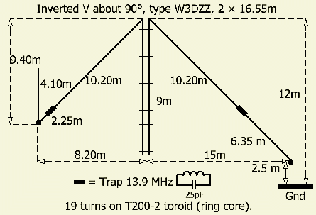 Bij mijn huidige inverted V antenne («fig) met dezelfde balun, waren de ingebouwde tuner van een TS-450 en de externe automatische tuner van een TS-50 in staat om de antenne op alle banden van 10 tot en met 80 m aan te passen. Dat was ook mogelijk met de vorige antenne van 2 × 13.5 m en een voedingslijn van 13.5 m.
