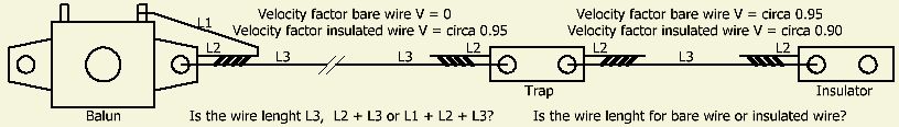 Helaas wordt bij gepubliceerde lengtes nooit vermeld of een afmeting geldt voor de draad (L3) tussen balun en trap, tussen trap en isolator en of de gevouwen stukken (L1, L2) deel uitmaken van de opgegeven maat. Verder is het van belang of er ongeïsoleerd of geïsoleerd draad werd toegepast.