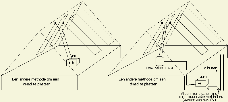 Draden aanbrengen volgens de tekening en foto kan ook een goed resultaat opleveren. Het voeden kan direct met een geschikte symmetrische ATU of "op afstand" met behulp van een goede 1 ÷ 4 coax-balun via een coaxkabel naar een asymmetrische tuner. Het is altijd verstandig om de metalen kast of de "aarde" van een tuner op een plankje goed met een metalen massa zoals de centrale verwarming te verbinden. Is dat niet aanwezig dan kan een ¼ golflengte draad per band op de zoldervloer voor een goede ontkoppeling zorgen. Een spiraalvormige tegen capaciteit zoals eerder getekend op het platte dak is ook een goede methode.