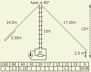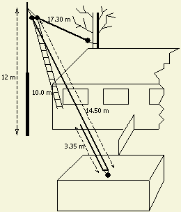 Hier volgt een voorbeeld hoe op mijn erf de ruimte zo goed mogelijk gebruikt werd met diverse inverted V antennes aan een 12 m lange mast. Diagonaal in de achtertuin is ruimte voor ongeveer 14.5 m draad. Voor afspannen en isolator is dan nog 0.5 m over. Voor de andere helft van de dipool is er in de zijtuin maximaal 17.30 m ter beschikking. Er is dan nog plaats voor afspannen en isolator.