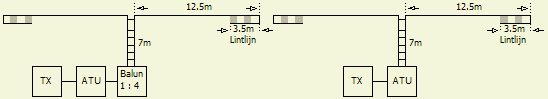 Het is een halve golf straler die met behulp van een HF trafo (1 : 49) aan het begin (of einde) gevoed wordt.