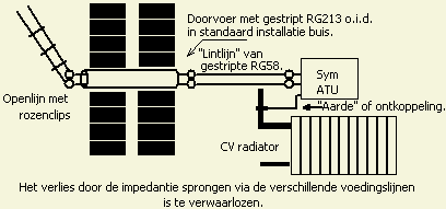 Binnenshuis gebruik ik zelf een "openlijn" dat gemaakt is door van twee coaxkabels de afscherming te verwijderen en met kabelbinders te fixeren. De verliezen die zouden ontstaan ten gevolge van de impedantie sprong bij de overgang van de "echte" openlijn naar dit alternatief, zijn te verwaarlozen.
