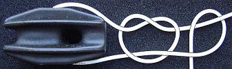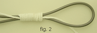 Een andere manier van bevestigen is met een knoop (fig») volgens de foto's. Bij deze methode gaat de steek niet los, maar is eventueel nog verstelbaar.