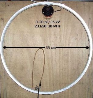 Om te experimenteren kunt een aluminium fietswiel (uit een kringloopwinkel «fig) gebruiken. De gaten van de spaken komen goed van pas bij het monteren van het een en ander. De koppeling met de antenne deed ik o. a. met een soort haarpin. Met de aangegeven maten en een 3 – 35 pF vacuüm variabele condensator kon het gebied 23.650 – 30 MHz afgestemd worden. Met een variabele condensator van ongeveer 100 pF wordt het bereik vergroot van 14 tot 30 MHz. Een betere werking verkrijgt men volgens mij door twee loops boven elkaar te plaatsen, zie MEIGHT .
