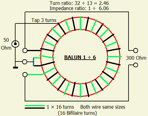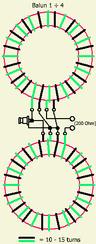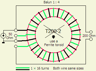 Aan de 200 Ω zijde (fig») van een 1 ÷ 4 balun staan twee spoelen van 16 windingen (2 × 16) in serie. De zelfinductie die parallel aan de openlijn staat, is dan voor een T200-2 ringkern (Al = 12nH):
