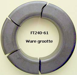 Via email kreeg ik het bericht dat een FT240-61 ringkern ook goed geschikt zou zijn om een balun voor 800–1000 W te maken. Hans PA1HR gaf mij onlangs een exemplaar cadeau. Daarmee werd een test gedaan door een 1 : 1 scheidingstrafo (zie verder) te maken en dat tussen een tuner en openlijn met antenne te plaatsen. De kern was gewikkeld met 2 × 11 windingen (= 2 × 21 µH). Vervolgens werd alles afgestemd op SWR = 1 en daarna een draaggolf gegeven van ongeveer 800 W. Binnen de 30 seconden spatte de ringkern met een knal in vier stukken uit elkaar (fig»). Uit deze proef blijkt weer duidelijk dat niet alle ferriet ringkernen geschikt zijn om tussen ATU en antennesysteem te gebruiken. Aan de ingang van een symmetrische tuner, waar een balun zowel aan de primaire als aan de secundaire kant niet reactief belast wordt, kan zonder bezwaar een FT240-61 toegepast worden.