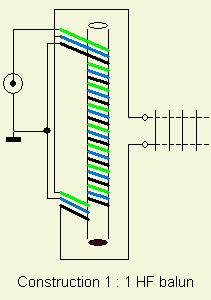 Een 1 ÷ 9 transformator («fig) voor een magnetische balun antenne vond ik op internet. De trafo is gemaakt met een rode Amidon T130-2 ringkern. Het rendement van het antennesysteem is twijfelachtig met zo'n kleine kern waarop niet veel windingen passen. Als in plaats van de balun een 50 Ω weerstand wordt geplaatst met hetzelfde stuk draad, dan heeft u waarschijnlijk een even effectieve antenne. Als u dat niet gelooft moet u het eens proberen. De weerstand neemt bijna al het vermogen op maar de draad straalt en tegenstations kunnen u ook nog horen. Rechts ziet u een militaire uitvoeringvan een choke balun.