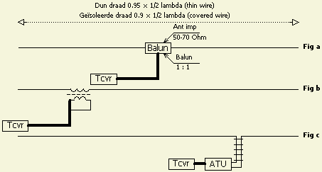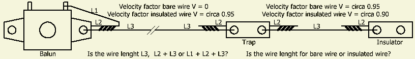 Bij alle vermelde lengtes wordt niet vermeld of de afmeting geldt voor de draad (L3) tussen balun en trap, tussen trap en isolator en of de gevouwen stukken (L1, L2) deel uitmaken van de opgegeven maat. Verder is het van belang of er ongeïsoleerd of geïsoleerd draad werd toegepast. In het laatse geval reken ik met een verkortingsfactor van V = 0.95
