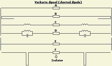 In deze tekening (fig») staan verkorte dipolen die qua resonantie gelijk zijn aan de eerste dipool in de kop van dit artikel. Door het elektrisch verkorten wordt de bandbreedte kleiner. De SWR blijft dan laag in een kleiner gebied. Ook de verliezen nemen toe door de aangebrachte veranderingen ten opzichte van een volledige halve golf straler.