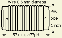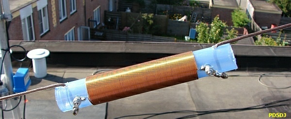 De spoel werd gewikkeld op een installatiebuis van 1 inch doorsnede met 0.6 mmØ geëmailleerd draad dat verwijderd was van de omtrek van een KTV beeldbuis. Ondanks het vrij dunne draad was 400 W zendvermogen geen probleem. De spoel met een aaneengesloten wikkeling heeft een lengte van 57 mm. Het was een vakantie antenne en als de spoelen bij het afbreken de grond raakten werd het emaille beschadigd. Daarom werd later een dikke soort tuinslang over de wikkeling aangebracht. Op de foto ziet u dat de zelfgemaakte spoel 77.07 µH geworden is. Dat hoeft niet zo exact te zijn, als u iets maakt in de orde van 75–80 µH dan moet u daarna wat experimenteren met de lengte van 2.4 m aan de uiteinden om uw favoriete plek met lage SWR in de 80 m band te verkrijgen. PD5DJ maakte deze antenne ook, op 40 m werkt dat zeer goed. De uiteinden werden toegesneden voor 3733 kHz DSSTV en ook daar gaat het naar behoren.