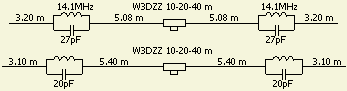 In de zeventiger jaren werd hier een kortere W3DZZ gemaakt voor 10, 20 en 40 m met een 25 pF condensator in de trap voor 7.05 MHz. De gegevens over deze zelfbouwantenne zijn helaas verloren gegaan door veel verhuizingen. In oudere Amerikaanse handboeken stond (fig») een W3DZZ ontwerp voor 10-20-40 m. De condensator verkort de antenne zodat er ook resonantie is op 10 m. Beide ontwerpen zijn (nog) niet door mij getest zodat u zelf de lengte van de uiteinden (met een PC programma?) moet uitdokteren om resonantie in de 40 m band te verkrijgen.