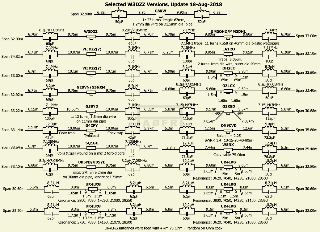 W8NX's ontwikkelde een antenne voor de Amerikaanse frequentiesegmenten 3.5–4.0 MHz en 7.0–7.3 MHz, 18 MHz en 28 MHz. Het bijzondere van het ontwerp is de andere plaats van de traps die afgestemd zijn op 5.16 MHz ± 25 kHz. Een lage SWR was er op 3.8, 7.12, en 28.4 MHz en SWR = 3 over de hele 17 m band. De antenne werd opgehangen als inverted V en gevoed met 75 Ohm coaxkabel en een 50 : 75 Ohm balun. De antenne werkte ook met 50 Ohm coaxkabel en 1÷1 balun, maar met de vorige voedingswijze was de SWR op 18 en 28 MHz beter.