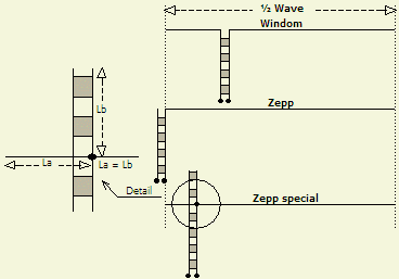 Wordt een ½ golf antenne aan één einde gevoed met een open lijn dan is het een Zepp antenne. Dat voeden kan ook op elk willekeurig ander punt (fig»), maar moet dan uitgevoerd worden volgens de tekening. Daarbij zijn de "uitstekende" einden van de voedingslijn (Lb) gelijk aan het laatste antennedeel (La) na het contactpunt dus La = Lb. Bij veel amateurs is deze manier onbekend terwijl het in hun situatie wel eens de oplossing kan zijn.