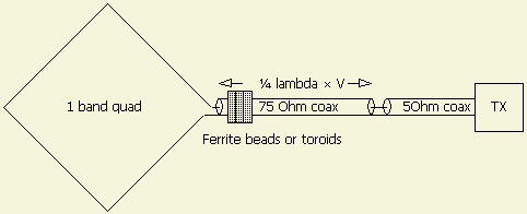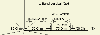 Here we match 36 Ohm of a vertical antenna (Gp) to 50 Ohm. If we consult the graphics with the division of 50 ÷ 36 = 1.39 ohms, we find 0.0821 × W. The actual length of both coaxes is 0.0821 × W × V. A coaxial cable with impedance close to 36 Ohm (fig ») is easy to manufacture by paralleling (fig») two 75 Ohm cables.