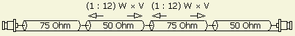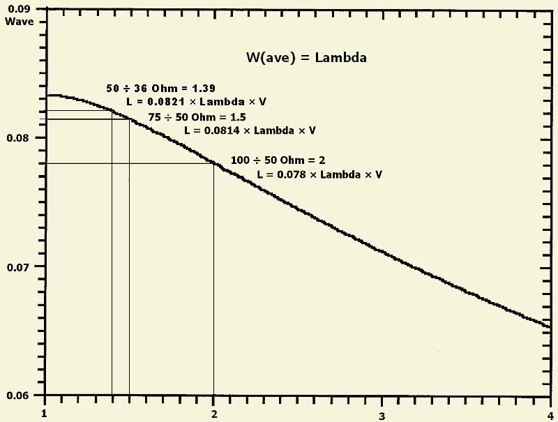 If one wants transfer 75 ohms impedance to 50 ohms, that is a ratio of 75 ÷ 50 = 1.5. According to the graph it is a wavelength of 0.0814 (W)ave. The actual length of the coaxial cables dependent on the velocity factors (V) and is then: 0.0814 × W × V.