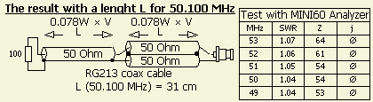 The length of the cables has been calculated for 50.100 MHz. The table shows the SWR if an induction free 100 Ohm resistor is matched to a 50 Ohm impedance. The system is clearly broadband! The conclusion could be that one does not need too accurate calculation.