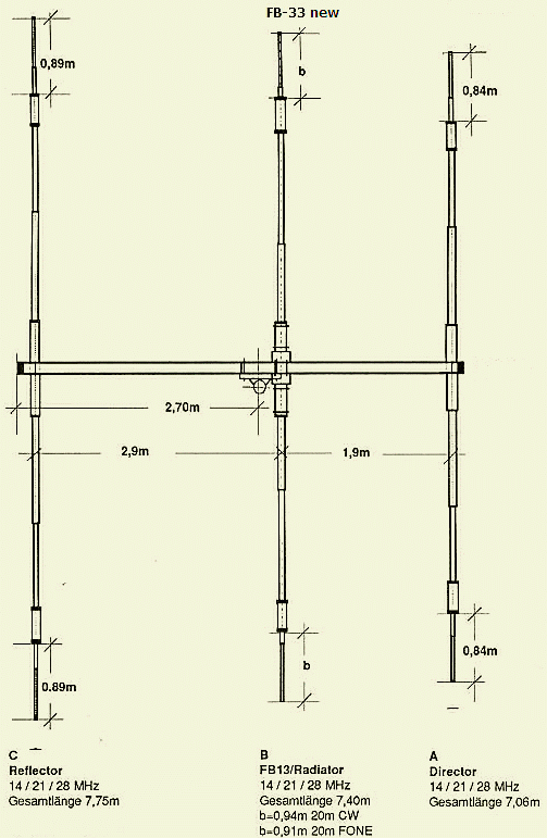 Van deze antenne is de radiator hetzelfde als van een FB-13 en FB-23. Alleen een director was beschikbaar voor de meting. Het antennedeel voor 20 m aan de 15 m trap is niet verwijderd en maakt deel uit van de totale capaciteit bij het meten van de resonantie.