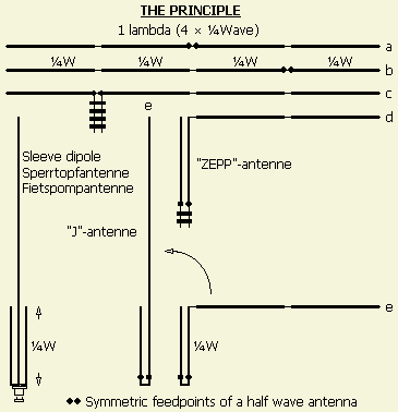 et kan beschouwd worden als een hele golf (1λ) dipool (fig») waarvan de helft (= ½λ) opgevouwen is. Omdat in het laatste geval de geleiders erg dicht naast elkaar liggen doen zij niet mee aan de eigenlijke straling. Symmetrische voeding van een hele golf antenne is mogelijk op drie plaatsen volgens figuren a, b en c (fig»). U ziet in figuur d dat als een halve golf (½λ) gedeelte gevouwen wordt, er nog steeds een symmetrisch voedingspunt blijft bestaan. Ook als het opgevouwen deel aan het uiteinde kortgesloten is, kan de zo gevormde kwart golf (¼λ haarpin) stub over zijn hele lengte symmetrisch gevoed worden. Bij de zogenaamde "J" antenne is het voedingspunt ook symmetrisch.De haarpin kan plaats maken voor een ¼λ buis of pijp als coaxiale stub en het is dan mogelijk om de antenne aan het onderste uiteinde te voeden. Zo verkrijgt men de fietspompantenne.