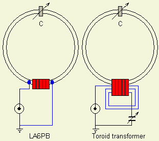 Right figure: A couple of toroids as transformer to match the low impedance of the loop to 50 Ohm. Eventually with an extra loading capacitor for easy matching.