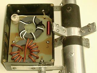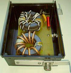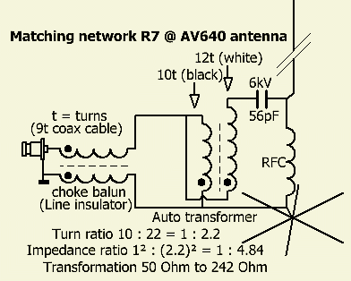 By coincidence, I found a matching network of an AV640 or R7 on eBay. With these antennas, the number of radials (= end capacitance) has increased and the 40 m band requires more self-inductance. That is why two stacked toroids have been installed for both the choke balun and the auto transformer. Given the number of turns of the transformer (10t + 12t), the transfer ratio is 1 ÷ 2.2 and impedance step up  1 ÷ 4.84. The system transforms the 50 Ohm asymmetrical impedance to a symmetrical impedance of 50 × 4.84 = 242 Ohm.